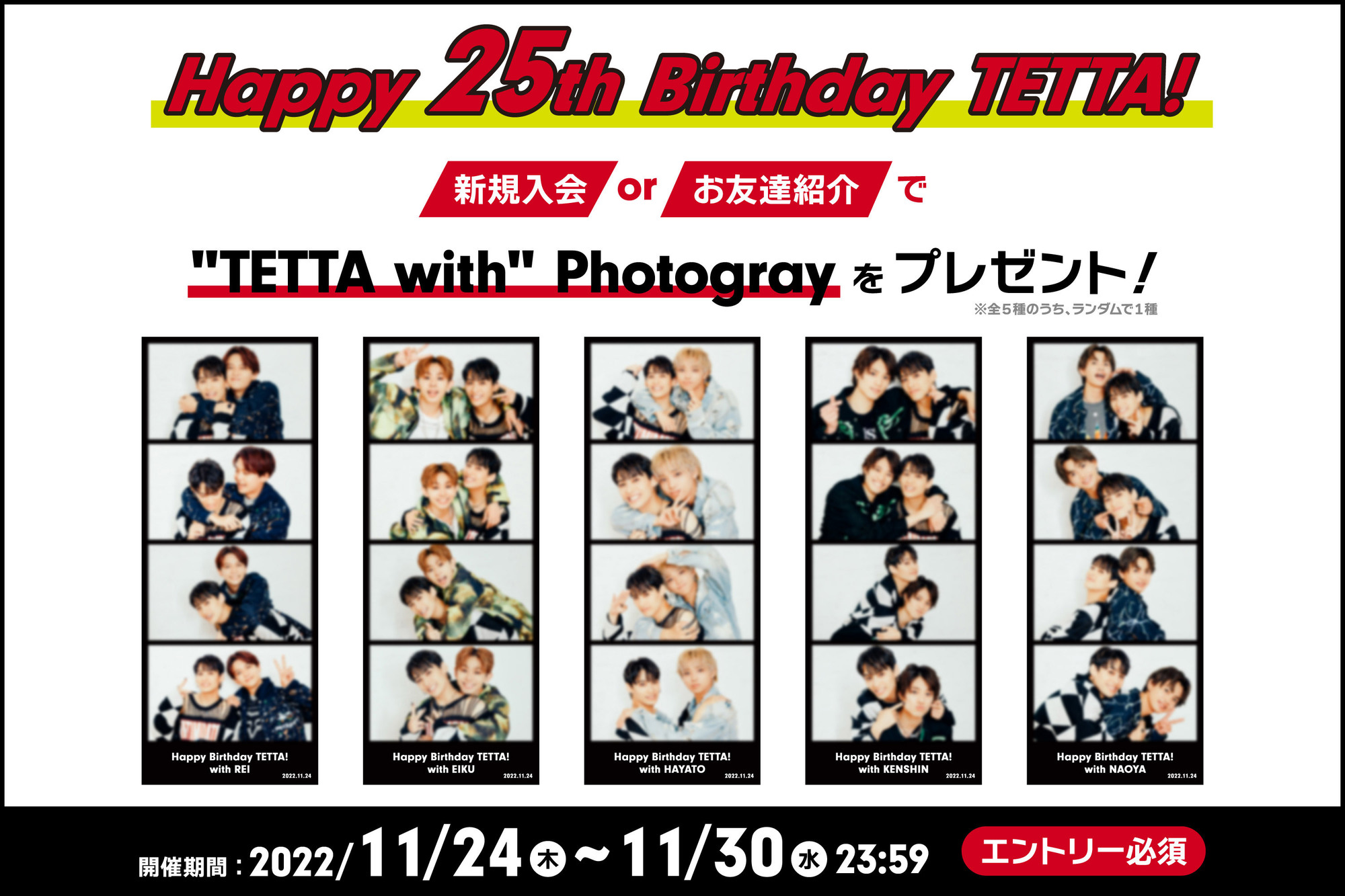 キャンペーン対象の期間内にオフィシャルファンクラブ"SWAG"へ新規入会・お友達紹介をして頂いた方に、「"TETTA with" Photogray」をプレゼント!(全5種のうち、ランダムで1種)